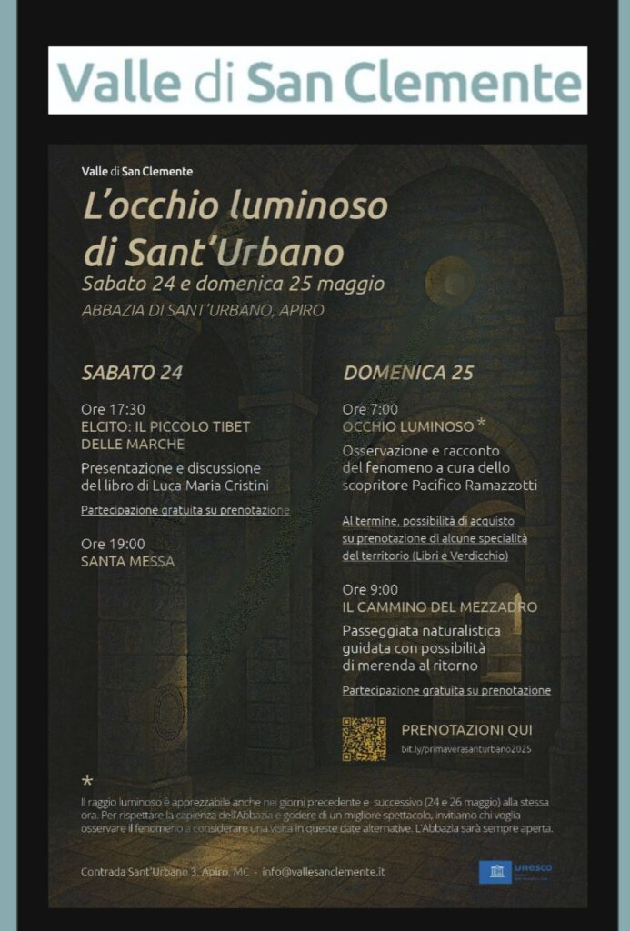Nelle mattine del 24 e 25 maggio, intorno alle ore 7:00, sarà possibile assistere al passaggio del raggio di sole che attraversa la chiesa, colpendo con precisione un’antica incisione nella pietra. Un evento raro e carico di emozione, che si verifica solo nel giorno dedicato al Santo Patrono di Apiro, Sant’Urbano, e il 29 luglio, quando il sole si trova nella stessa posizione celeste.