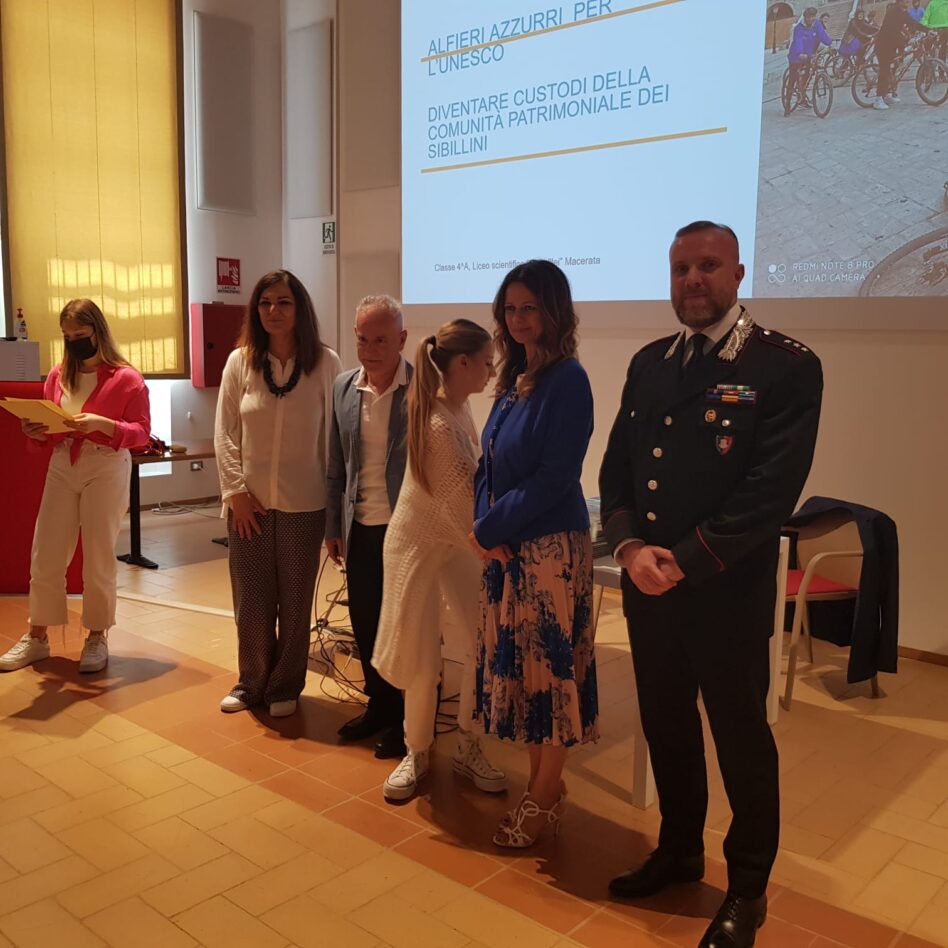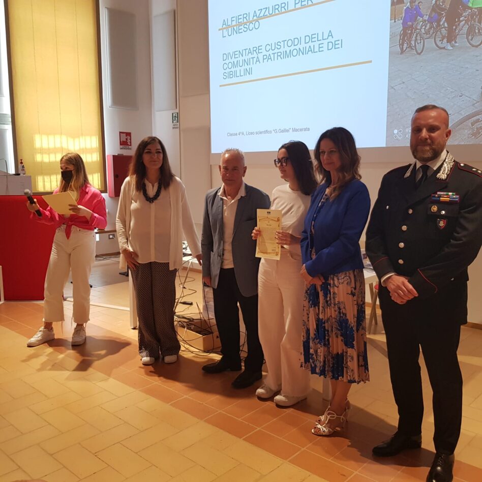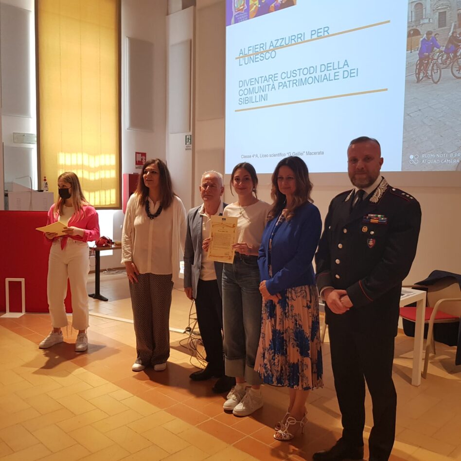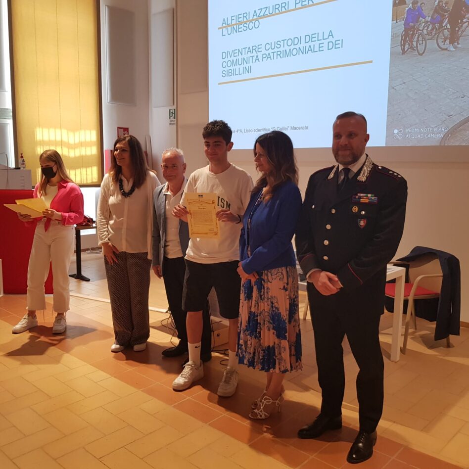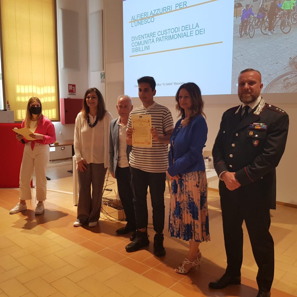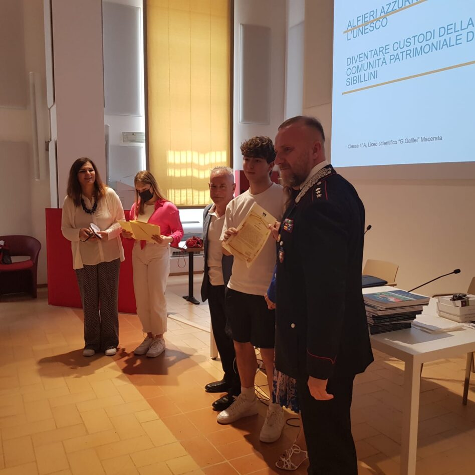 Nella cornice dell’Auditorium della Biblioteca Mozzi Borgetti di Macerata, alla presenza dell’ Ospite d’onore Cap. Mattia Ivano Losciale, Comandante del Nucleo Carabinieri Tutela Patrimonio Culturale di Ancona, si è svolta la cerimonia di consegna degli attestati di “Alfieri Azzurri per l’UNESCO” agli studenti della Classe IV A del Liceo Scientifico “Galileo Galilei” di Macerata. Gli studenti, nel corso dell’anno scolastico, hanno sviluppato con la docente di storia e filosofia, Prof.ssa Stefania Monteverde, un percorso didattico multidisciplinare di conoscenza dell’UNESCO e di esperienza sul territorio alla scoperta dei Patrimoni storici, culturali e ambientali dei Sibillini e delle Terre Appenniniche, candidate al programma MaB per il riconoscimento di Riserva della Biosfera UNESCO.