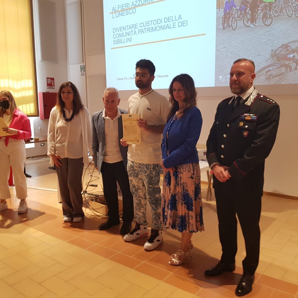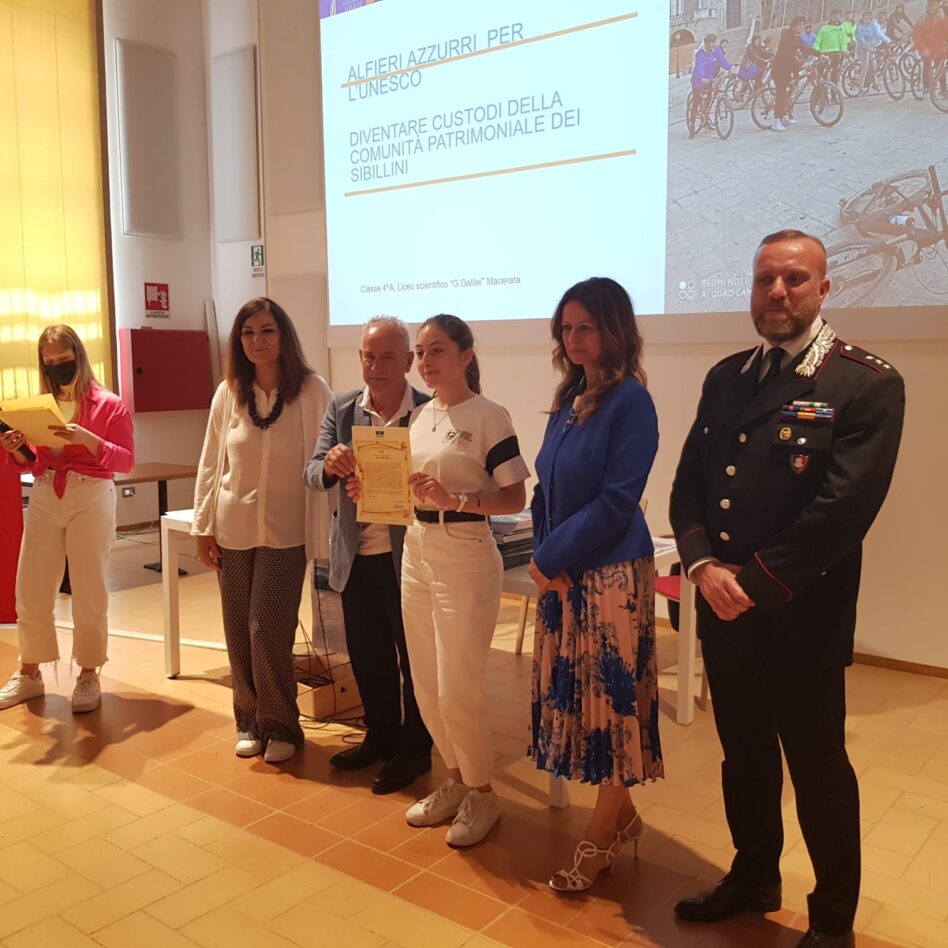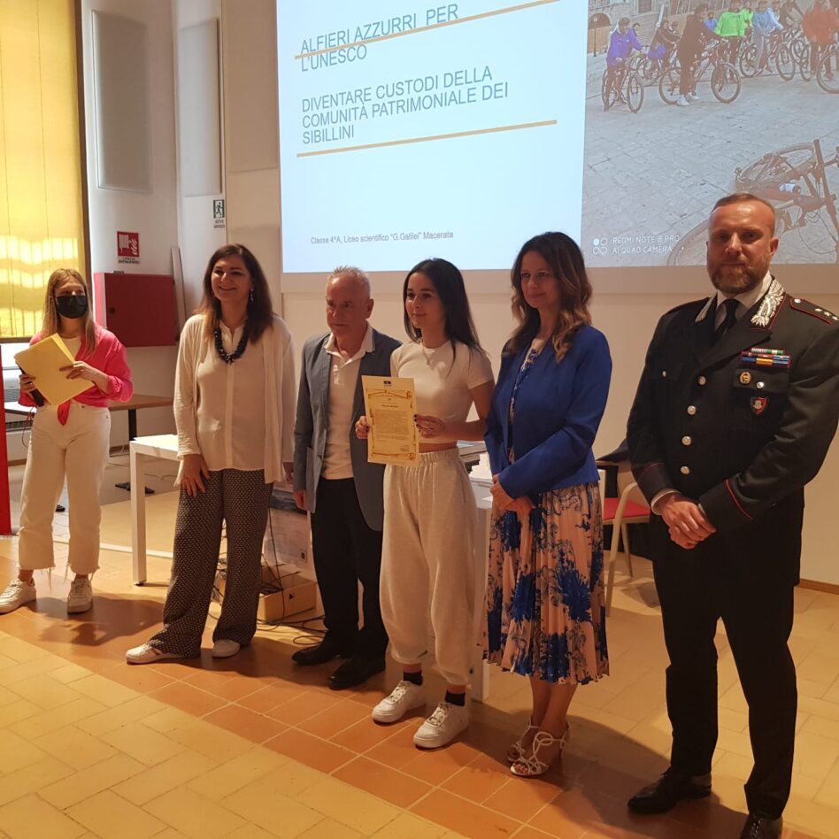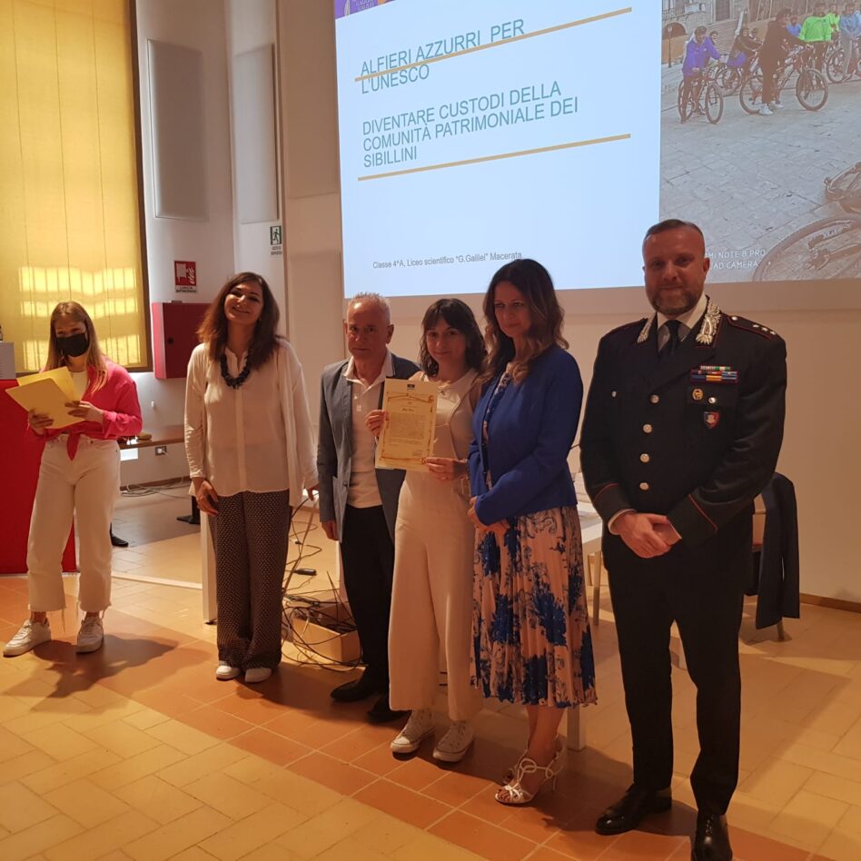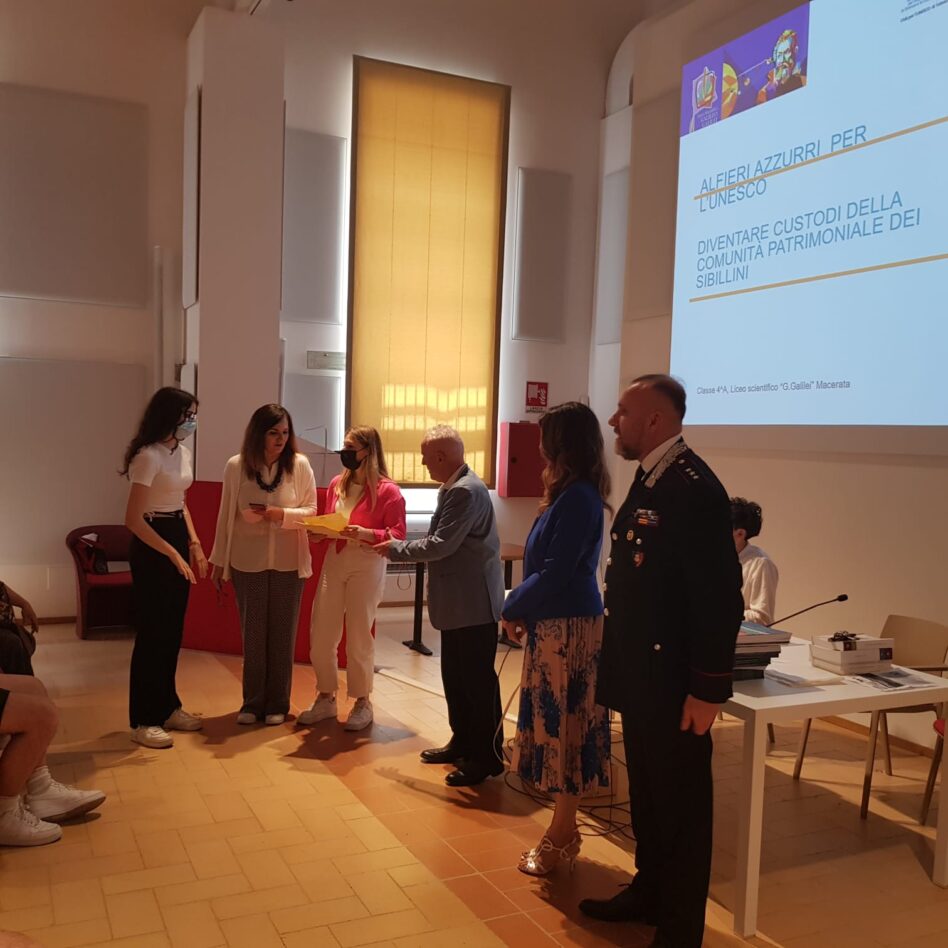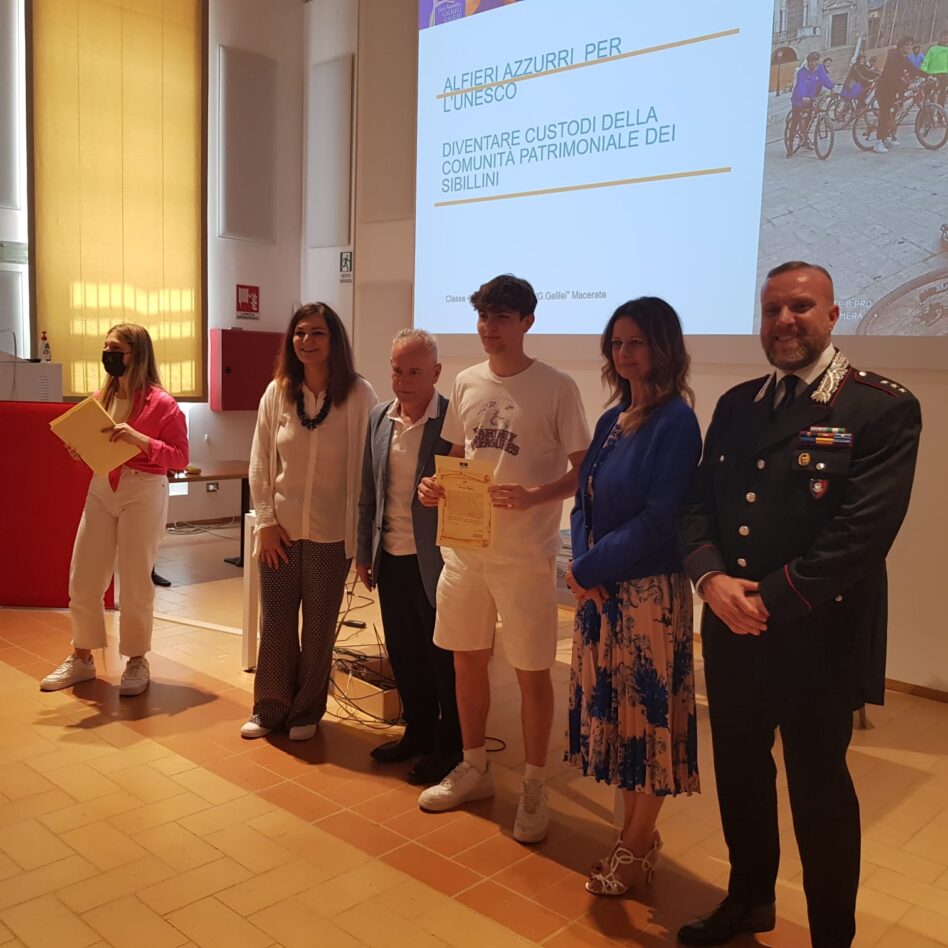 Nella cornice dell’Auditorium della Biblioteca Mozzi Borgetti di Macerata, alla presenza dell’ Ospite d’onore Cap. Mattia Ivano Losciale, Comandante del Nucleo Carabinieri Tutela Patrimonio Culturale di Ancona, si è svolta la cerimonia di consegna degli attestati di “Alfieri Azzurri per l’UNESCO” agli studenti della Classe IV A del Liceo Scientifico “Galileo Galilei” di Macerata. Gli studenti, nel corso dell’anno scolastico, hanno sviluppato con la docente di storia e filosofia, Prof.ssa Stefania Monteverde, un percorso didattico multidisciplinare di conoscenza dell’UNESCO e di esperienza sul territorio alla scoperta dei Patrimoni storici, culturali e ambientali dei Sibillini e delle Terre Appenniniche, candidate al programma MaB per il riconoscimento di Riserva della Biosfera UNESCO.
