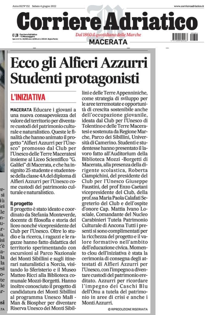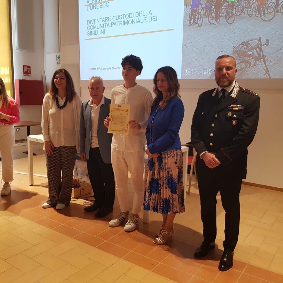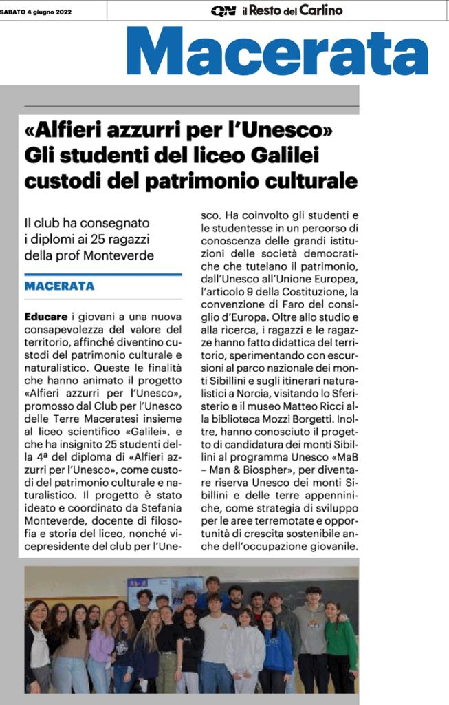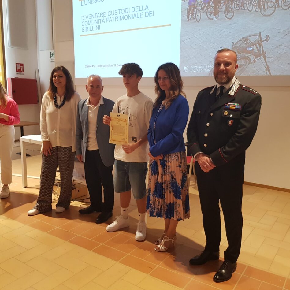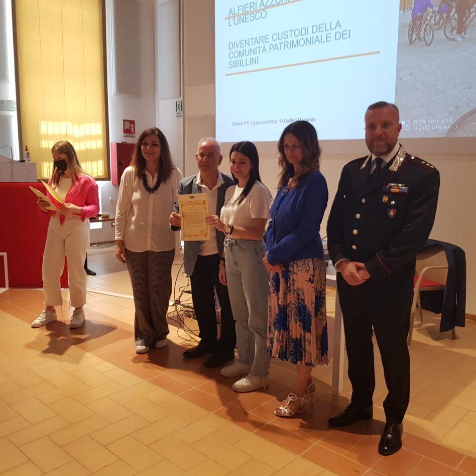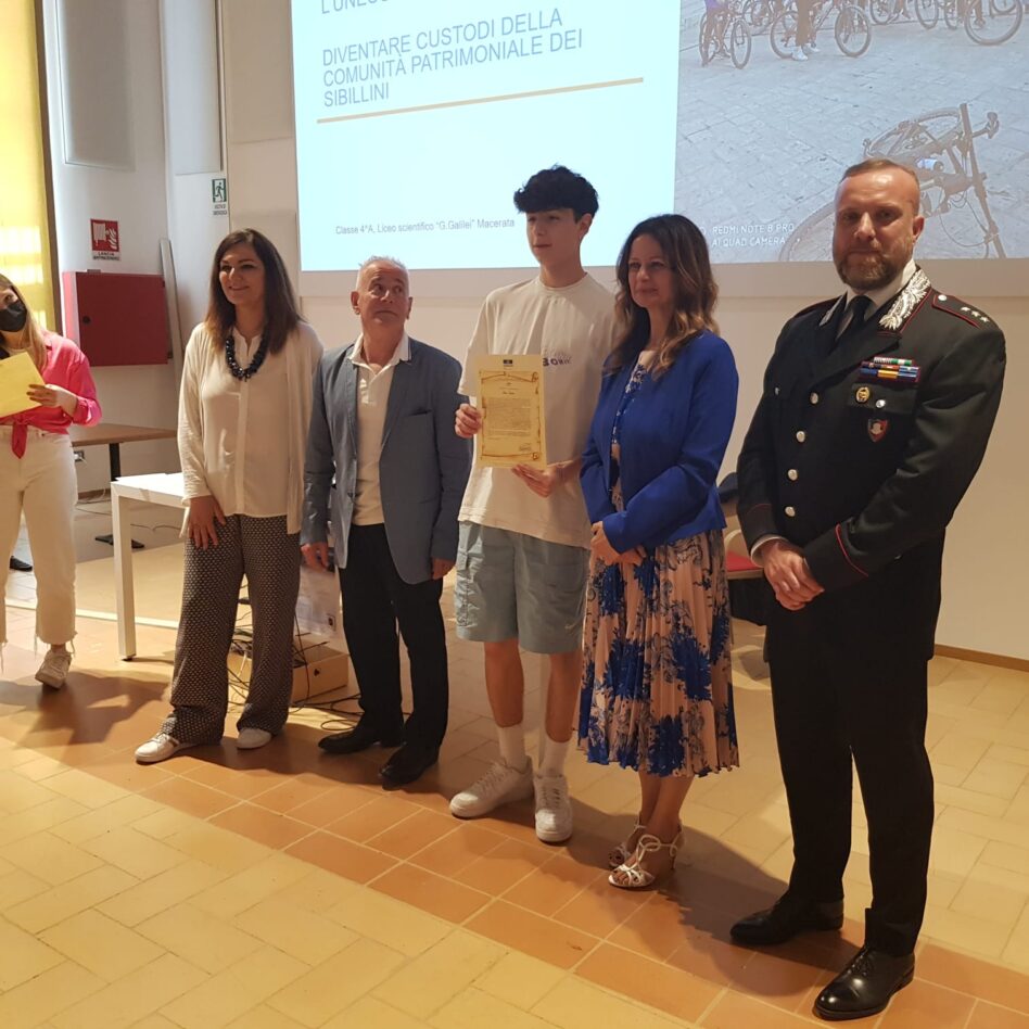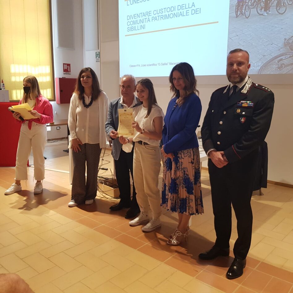 Nella cornice dell’Auditorium della Biblioteca Mozzi Borgetti di Macerata, alla presenza dell’ Ospite d’onore Cap. Mattia Ivano Losciale, Comandante del Nucleo Carabinieri Tutela Patrimonio Culturale di Ancona, si è svolta la cerimonia di consegna degli attestati di “Alfieri Azzurri per l’UNESCO” agli studenti della Classe IV A del Liceo Scientifico “Galileo Galilei” di Macerata. Gli studenti, nel corso dell’anno scolastico, hanno sviluppato con la docente di storia e filosofia, Prof.ssa Stefania Monteverde, un percorso didattico multidisciplinare di conoscenza dell’UNESCO e di esperienza sul territorio alla scoperta dei Patrimoni storici, culturali e ambientali dei Sibillini e delle Terre Appenniniche, candidate al programma MaB per il riconoscimento di Riserva della Biosfera UNESCO.