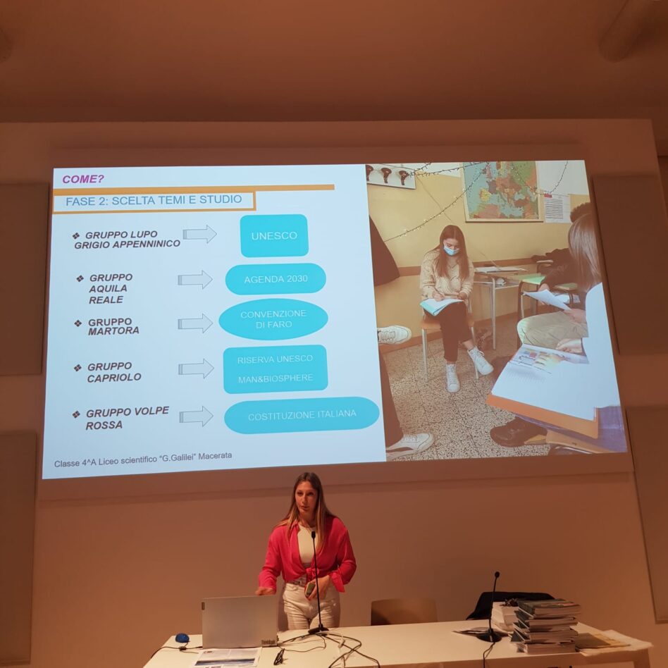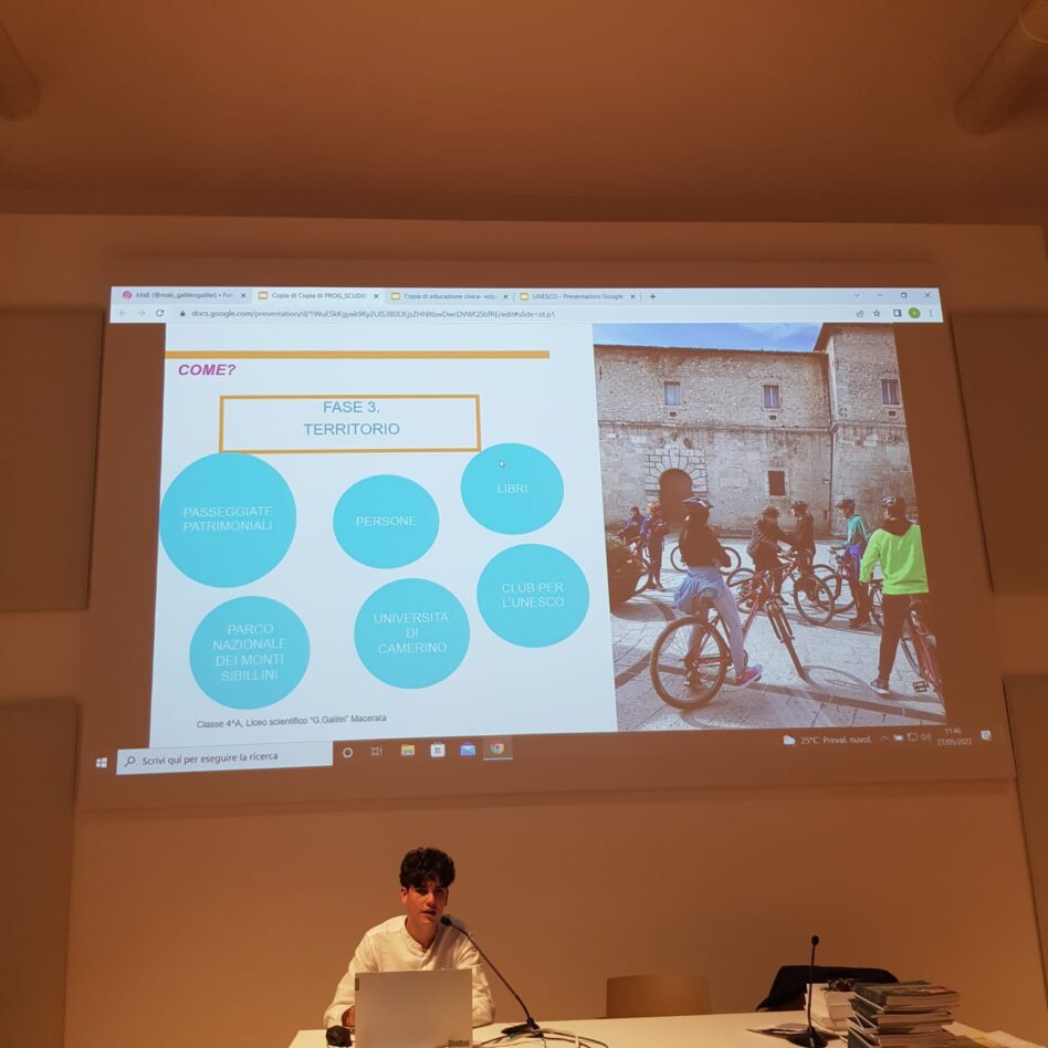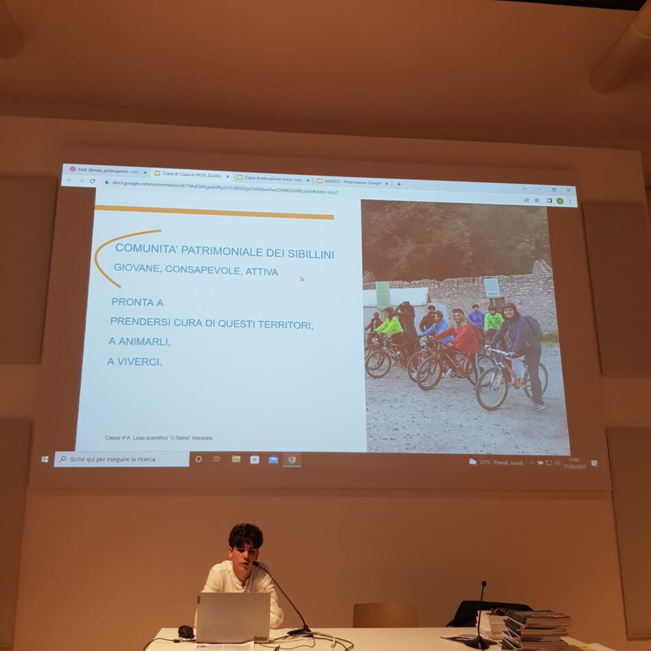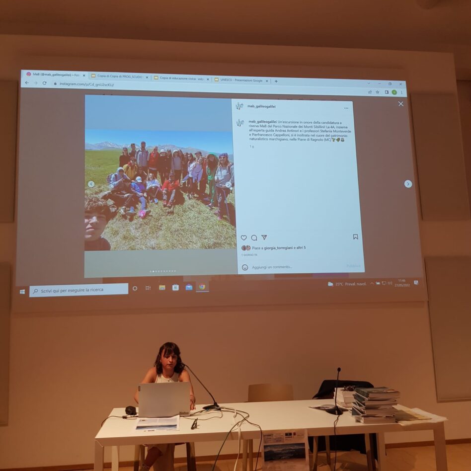 Nel corso dell’anno, poi, i ragazzi e le ragazze hanno fatto tante esperienze significative. Sono stati a Norcia, nel Parco Nazionale dei Monti Sibillini, percorrendo itinerari naturalistici con un bike-tour e sperimentando il rafting nel fiume Nera come esperienza di immersione nella natura. Hanno visto sulla piazza di Norcia i danni del terremoto del 2016 e la lentezza della ricostruzione. A Macerata hanno visitato lo Sferisterio come patrimonio culturale ereditato dalla comunità maceratese, che investe risorse pubbliche per valorizzarlo. Hanno incontrato esperti per approfondire diversi argomenti: Antonello Andreani del Club per l’Unesco delle Terre Maceratesi sul tema della candidatura della Riserva della Biosfera dei Sibillini; Andrea Antinori, geologo, scrittore e esperto conoscitore dei Monti Sibillini; Lucia Tancredi, scrittrice di fama che, tra l’altro, ha raccontato il patrimonio artistico del territorio in Racconti di viaggio. Le città d’arte della Marca maceratese (Quodlibet 2003), nonché loro insegnante di lettere; il presidente del Parco Nazionale dei Monti Sibillini. Tra le esperienze interessanti, va ricordata la presentazione del progetto da parte di Alessio Iommi e Margherita Durigon, studenti della classe, al meeting online “L’educazione trasformativa per lo sviluppo sostenibile” il 31 marzo 2022, promosso dalla FICLU – Federazione Club per l’UNESCO. Molto significativa è stata anche la partecipazione al convegno organizzato dall’IPSEOA “G. Varnelli” di Cingoli il 21 aprile, dal titolo “Dall’UNESCO alla Riserva MaB dei Sibillini e delle Terre Appenniniche: una proposta per una sintesi virtuosa tra uomo e ambiente”, in cui sei ragazzi e ragazze della classe – Agnese Barcaioni, Daniele Consoli, Margherita Durigon, Filippo Grisostomi, Serena Paoli, Francesco Spina – hanno potuto confrontarsi sul tema anche con coetanei di altre scuole.