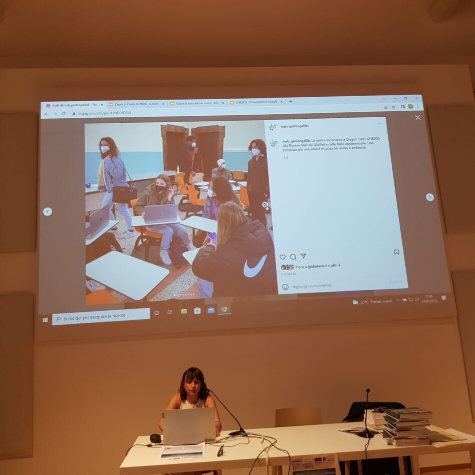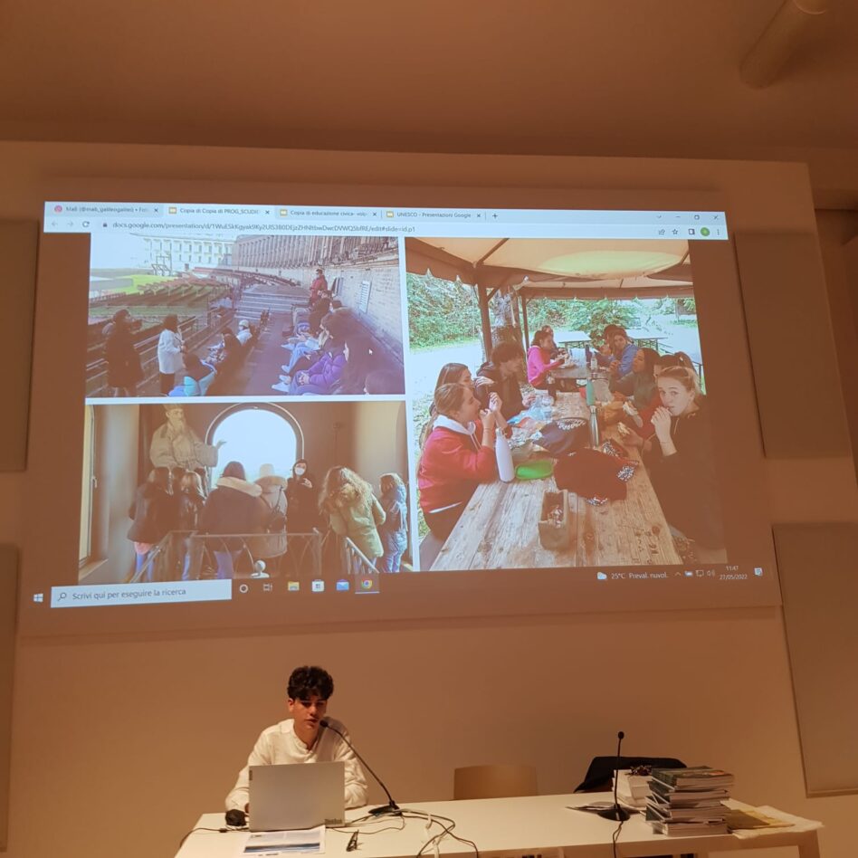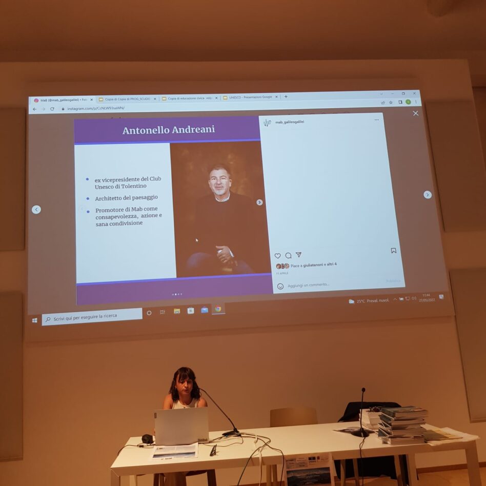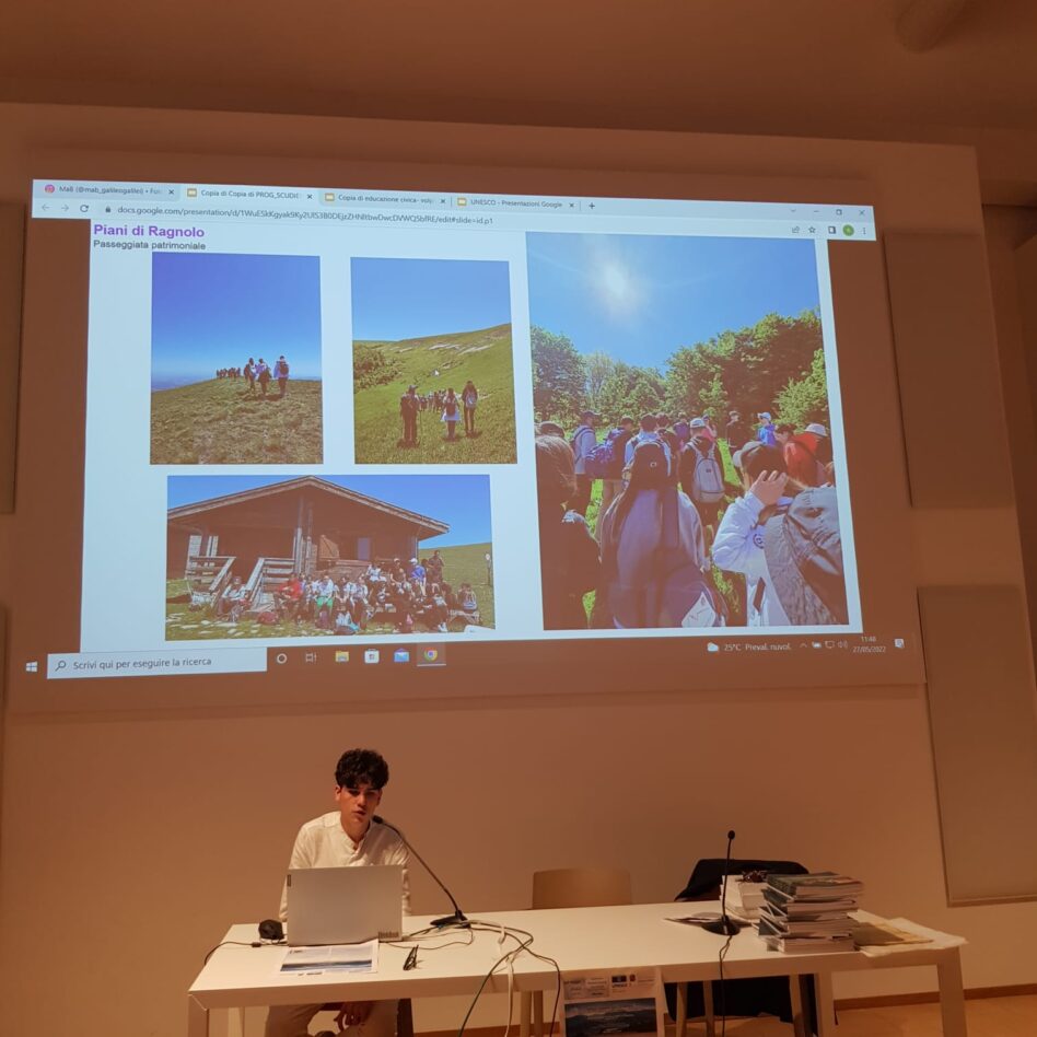 Nel corso dell’anno, poi, i ragazzi e le ragazze hanno fatto tante esperienze significative. Sono stati a Norcia, nel Parco Nazionale dei Monti Sibillini, percorrendo itinerari naturalistici con un bike-tour e sperimentando il rafting nel fiume Nera come esperienza di immersione nella natura. Hanno visto sulla piazza di Norcia i danni del terremoto del 2016 e la lentezza della ricostruzione. A Macerata hanno visitato lo Sferisterio come patrimonio culturale ereditato dalla comunità maceratese, che investe risorse pubbliche per valorizzarlo. Hanno incontrato esperti per approfondire diversi argomenti: Antonello Andreani del Club per l’Unesco delle Terre Maceratesi sul tema della candidatura della Riserva della Biosfera dei Sibillini; Andrea Antinori, geologo, scrittore e esperto conoscitore dei Monti Sibillini; Lucia Tancredi, scrittrice di fama che, tra l’altro, ha raccontato il patrimonio artistico del territorio in Racconti di viaggio. Le città d’arte della Marca maceratese (Quodlibet 2003), nonché loro insegnante di lettere; il presidente del Parco Nazionale dei Monti Sibillini. Tra le esperienze interessanti, va ricordata la presentazione del progetto da parte di Alessio Iommi e Margherita Durigon, studenti della classe, al meeting online “L’educazione trasformativa per lo sviluppo sostenibile” il 31 marzo 2022, promosso dalla FICLU – Federazione Club per l’UNESCO. Molto significativa è stata anche la partecipazione al convegno organizzato dall’IPSEOA “G. Varnelli” di Cingoli il 21 aprile, dal titolo “Dall’UNESCO alla Riserva MaB dei Sibillini e delle Terre Appenniniche: una proposta per una sintesi virtuosa tra uomo e ambiente”, in cui sei ragazzi e ragazze della classe – Agnese Barcaioni, Daniele Consoli, Margherita Durigon, Filippo Grisostomi, Serena Paoli, Francesco Spina – hanno potuto confrontarsi sul tema anche con coetanei di altre scuole.