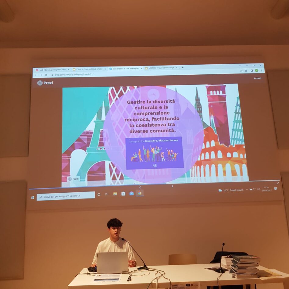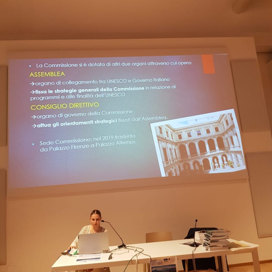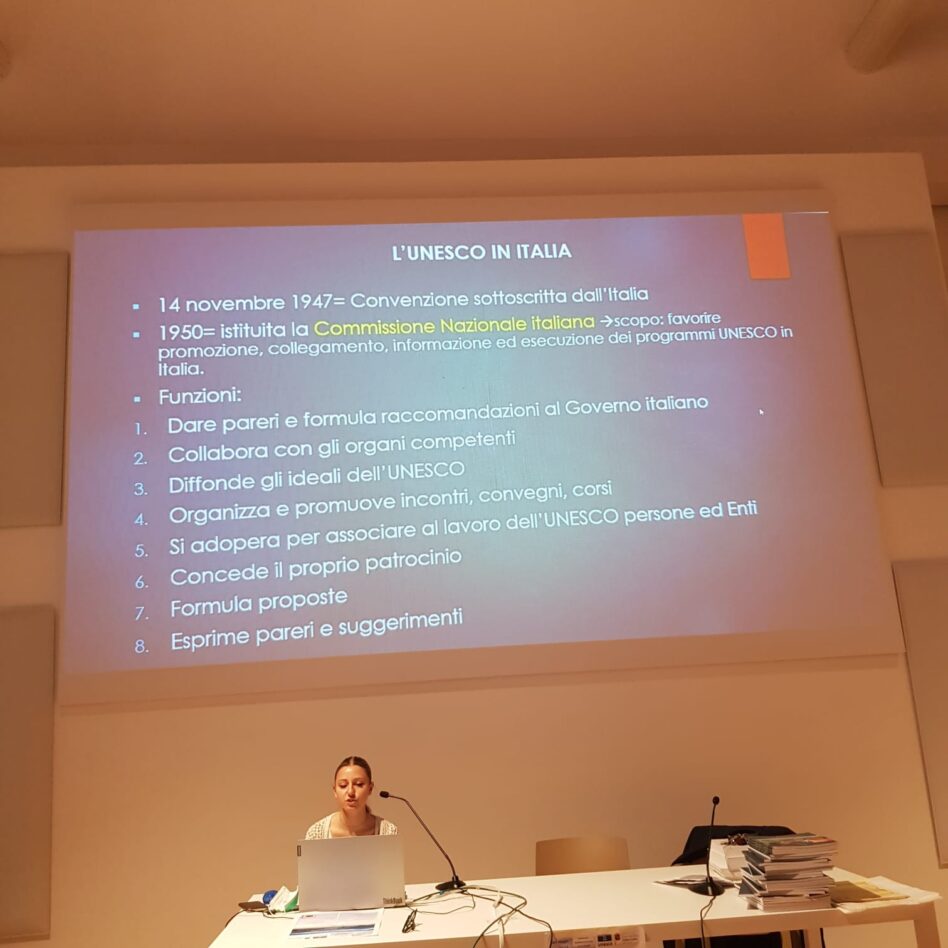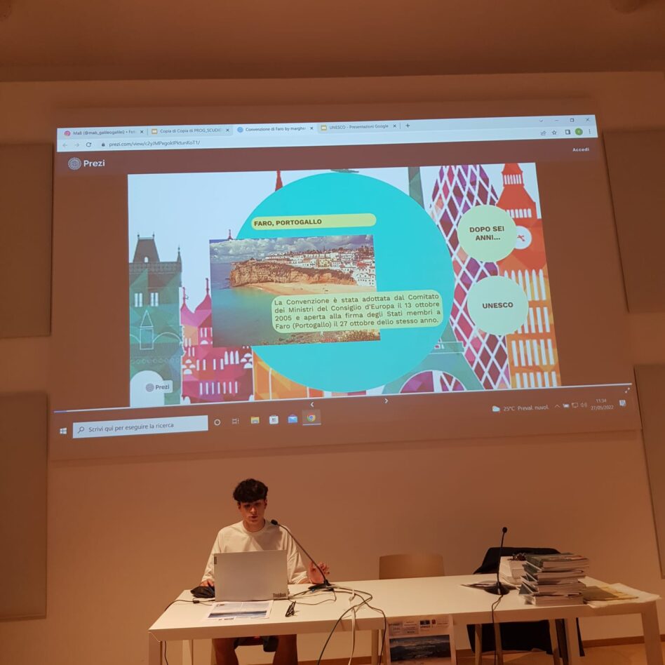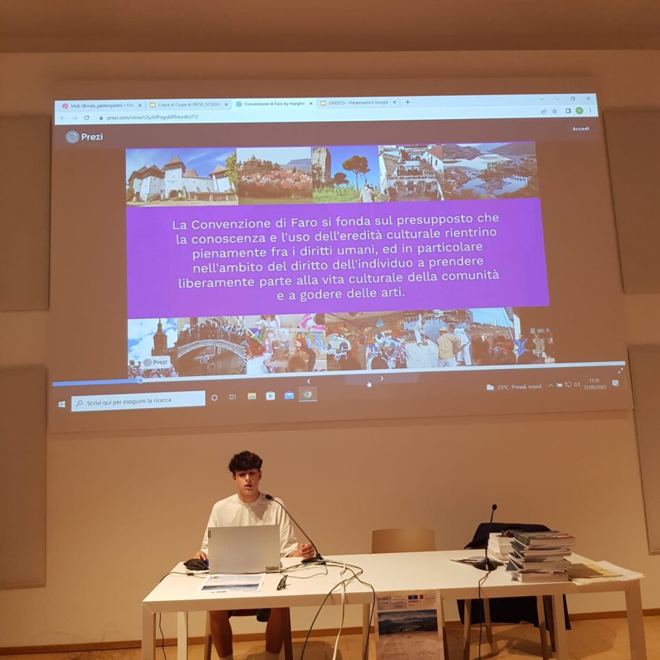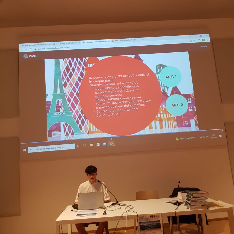 Il progetto si conclude con una cerimonia: il presidente del Club per l’UNESCO delle Terre Maceratesi ha insignito studenti, studentesse e docenti che hanno partecipato al progetto con l’attestato degli Alfieri Azzurri per l’Unesco, con cui viene solennemente consegnato il compito di essere custodi delle comunità patrimoniali in cui vivono, impegnandosi a studiarle, a curarne il patrimonio e a trasmetterlo. La simbologia dell’alfiere richiama l’immagine del “portare l’insegna”, e metaforicamente intende indicare il compito di essere “bandiere viventi” per segnalare i patrimoni culturali materiali e immateriali che abbiamo ereditato, con l’impegno a prendersene cura e a diffonderne la conoscenza con le insegne della memoria e della creatività. Nel colore azzurro c’è il richiamo ai Caschi Blu della Cultura, la task force Unite4Heritage costituita nel 2016, su proposta dell’Italia in accordo con l’UNESCO, per la salvaguardia del patrimonio culturale nelle aree di crisi. C’è anche il richiamo all’azzurro dei Monti Sibillini, “quei monti azzurri” come li chiama Leopardi nelle “Ricordanze”. Durante la cerimonia, studenti e studentesse hanno presentano il lavoro con i prodotti digitali realizzati, sottolineando in particolare le esperienze personali più trasformative e generative di nuove idee.