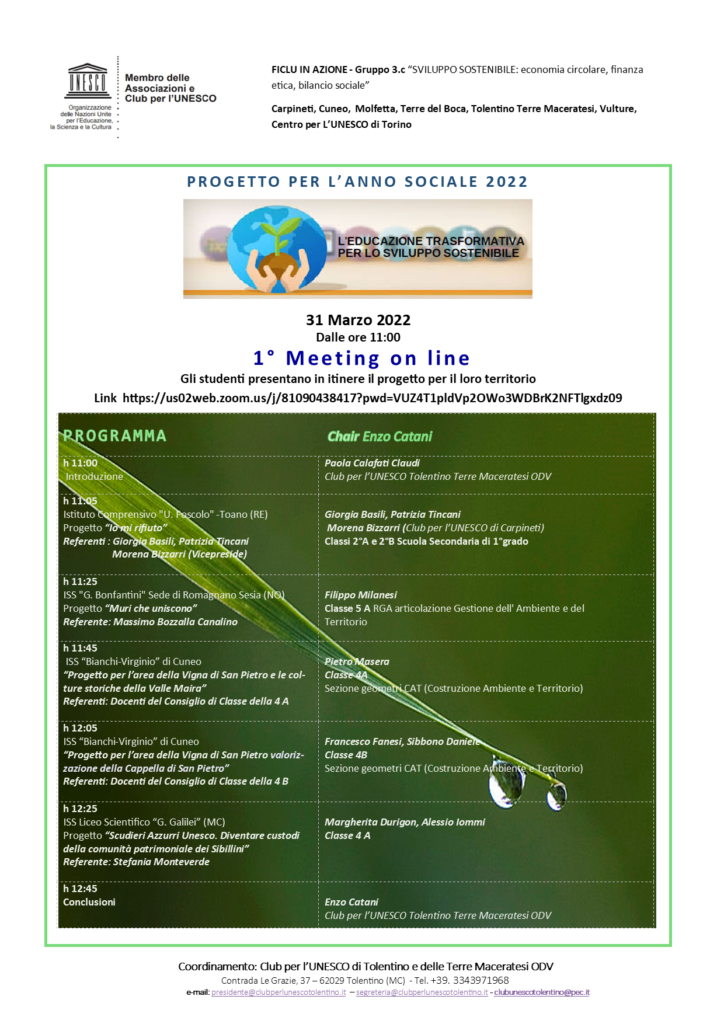 Primo meeting di comunicazione tra studenti di scuole di diverso ordine e grado, organizzato dal Gruppo 3.c del programma FICLU in azione. Il gruppo è formato dai Club per l’UNESCO di Carpineti, Cuneo, Molfetta, Terre del Boca, Tolentino Terre Maceratesi, Vulture, Centro per L’UNESCO di Torino