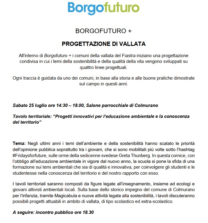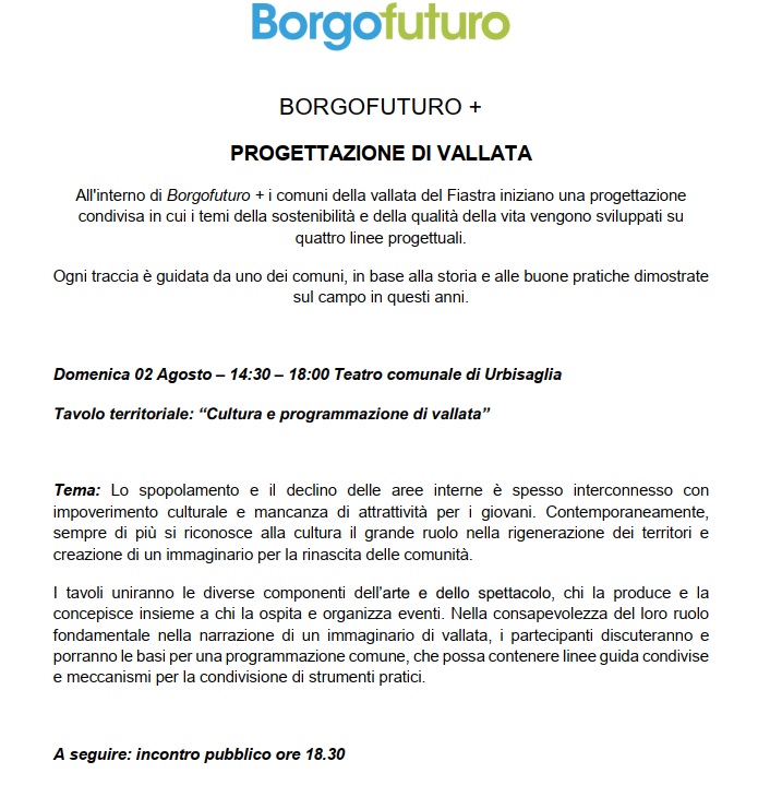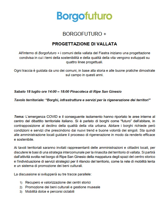 Partecipazione al Tavolo di lavoro organizzato a Ripe San Ginesio nel contesto di BORGOFUTURO Festival + sul tema “Borghi , Infrastrutture, e servizi per la rigenerazione dei territori” . Nello specifico abbiamo partecipato alla discussione su “Promozione dei beni culturali e gestione museale.